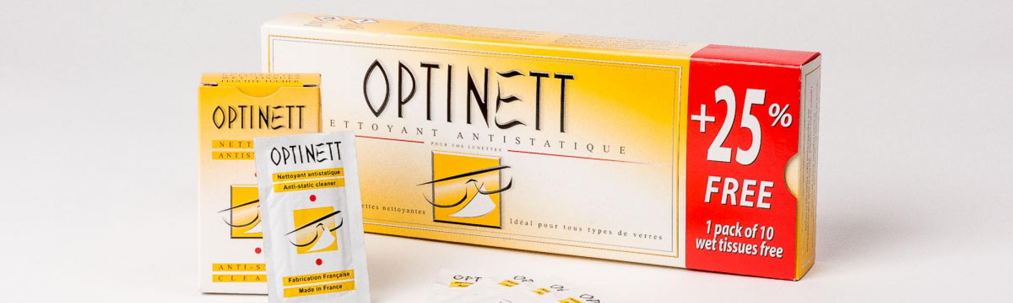 Een bekend onderdeel binnen het aanbod zijn de vochtige reinigingsdoekjes, ontwikkeld om brillenglazen te reinigen en te ontvetten zonder krassen te veroorzaken. Ze zijn geschikt voor verschillende soorten glazen, waaronder mineraal, organisch en polycarbonaat. Daarbij is er ook sprake van een antistatische werking, bedoeld om stof en vuil minder kans te geven zich snel opnieuw vast te zetten.