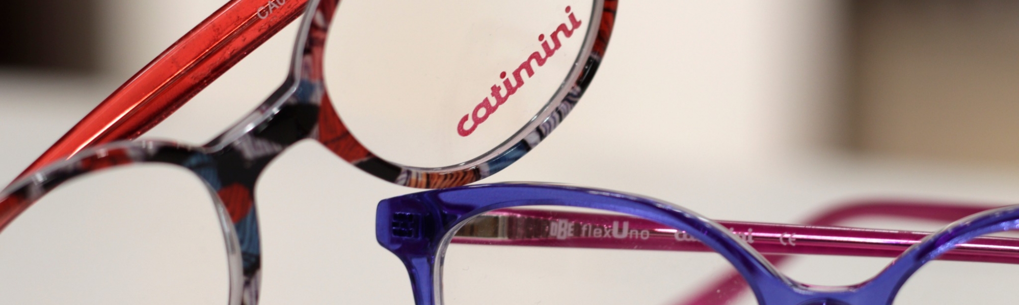 • Kinderbrilmonturen met een duidelijke modereferentie, gebaseerd op kleuren en prints uit de Catimini kledingwereld.