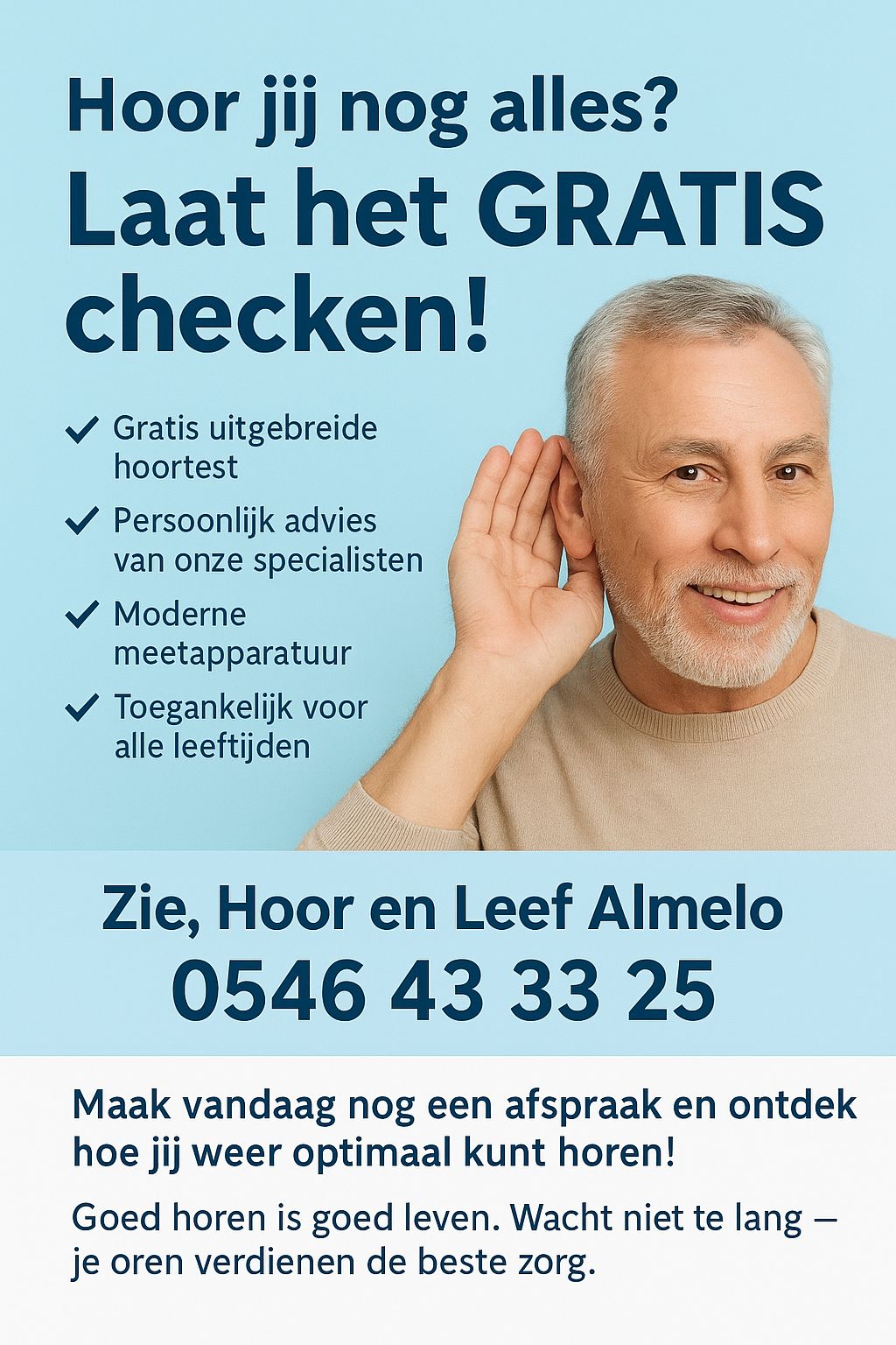Aan de Grotestraat 11 in het centrum van Almelo vind je Zie, Hoor & Leef: een toegankelijke en deskundige speciaalzaak waar oogzorg, hoorzorg en persoonlijke service samenkomen. Zoals de naam al zegt, draait het hier om meer dan alleen goed zien of horen – het gaat om comfortabel leven, met oplossingen die écht passen bij jouw dagelijkse behoeften.